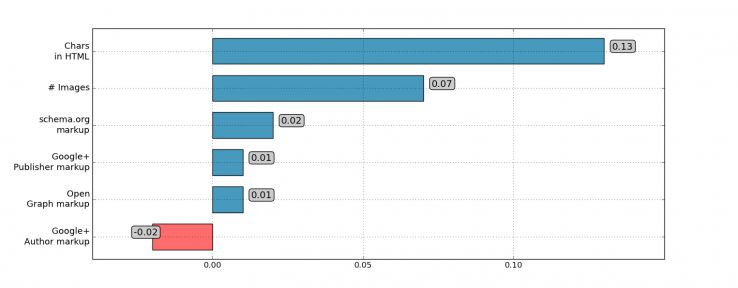 實(shí)驗(yàn)同時(shí)測(cè)試了額外的一些頁面優(yōu)化數(shù)據(jù)的相關(guān)性,例如結(jié)構(gòu)性標(biāo)注(schema.org),結(jié)果發(fā)現(xiàn)相關(guān)性趨于0,因此推測(cè)這些因素暫時(shí)還沒有作為排名因素。包括:Html字符數(shù)、圖片、schema標(biāo)注、Google+的發(fā)布者標(biāo)注、Open的圖表標(biāo)注、Google+的作者標(biāo)注。