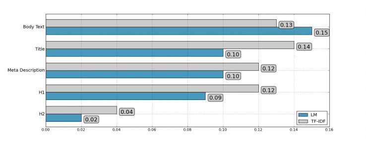從詞頻得分和語言模式得分兩個(gè)方面測(cè)算文檔和關(guān)鍵詞的相關(guān)性,結(jié)果發(fā)現(xiàn),標(biāo)題標(biāo)簽、Html內(nèi)容、meta標(biāo)簽、h1標(biāo)簽都是高度相關(guān)的。