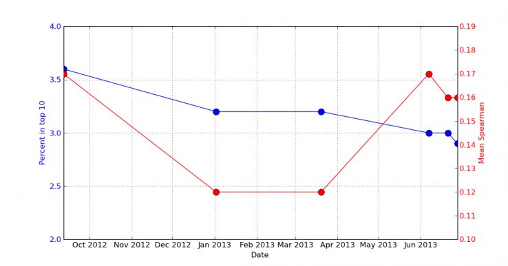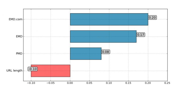 令人驚奇的是,排名首頁的EMD域名的比例逐年下降。從相關(guān)性來看,EMD是蹺蹺板形態(tài),在13年的3月份又上升了。之前的下降應(yīng)該是Google針對(duì)EMD的調(diào)整,而相關(guān)性的上升說明EMD在高排名的頁面中還是存在的,只是不再那么流行而已。