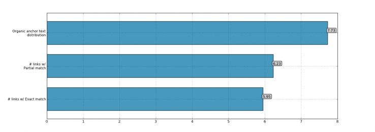 過去的兩年,Google對(duì)過分優(yōu)化錨文本進(jìn)行了嚴(yán)厲的打擊,但是從數(shù)據(jù)中發(fā)現(xiàn),無論是部分匹配還是精準(zhǔn)匹配,錨文本的相關(guān)度依然非常高。